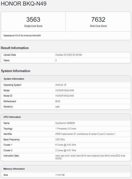 Honor Magic 8Pro tested with Snapdragon 8 Elite 5 chip, 12GB RAM, and Android 16.