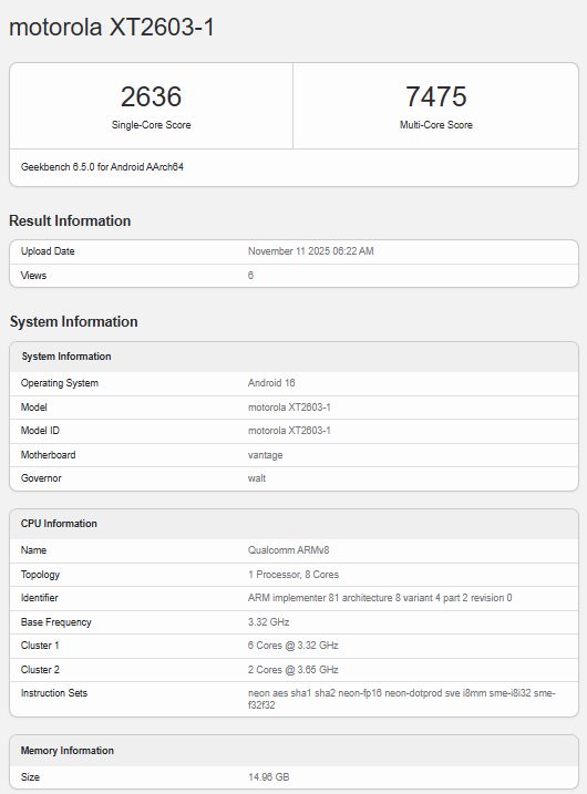 This is likely to be the Snapdragon 8 Gen5 chipset. The Geekbench listing further reveals that the Moto X70 Ultra has 16GB of RAM and Android 16. It scored 2,634 in the single-core test and 7,475 in the multi-core test.