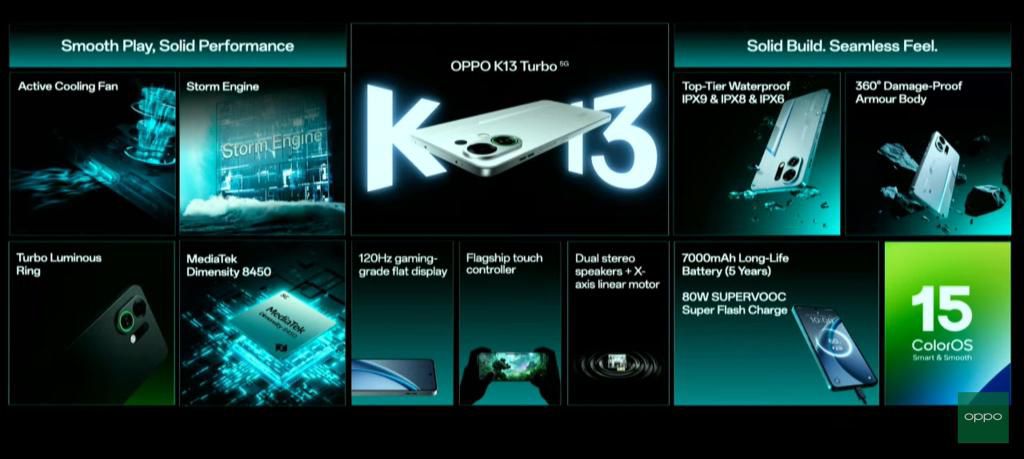 - Oppo K13 Turbo comes with a Mediatek Dimensity 8450 processor.